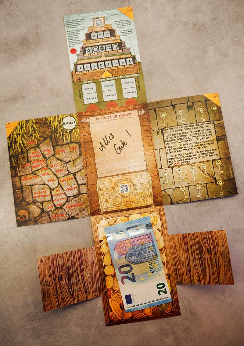 Die beschenkte Person muss 3 Rätsel lösen, um die Karte zu öffnen. Um die Rätsel haben wir uns bereits gekümmert. Du musst nur noch dein Geschenk hineinlegen und die Karte verschließen.