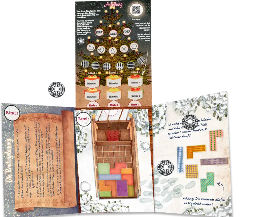 Die beschenkte Person muss 3 Rätsel lösen, um die Karte zu öffnen. Um die Rätsel haben wir uns bereits gekümmert. Du musst nur noch dein Geschenk hineinlegen und die Karte verschließen.